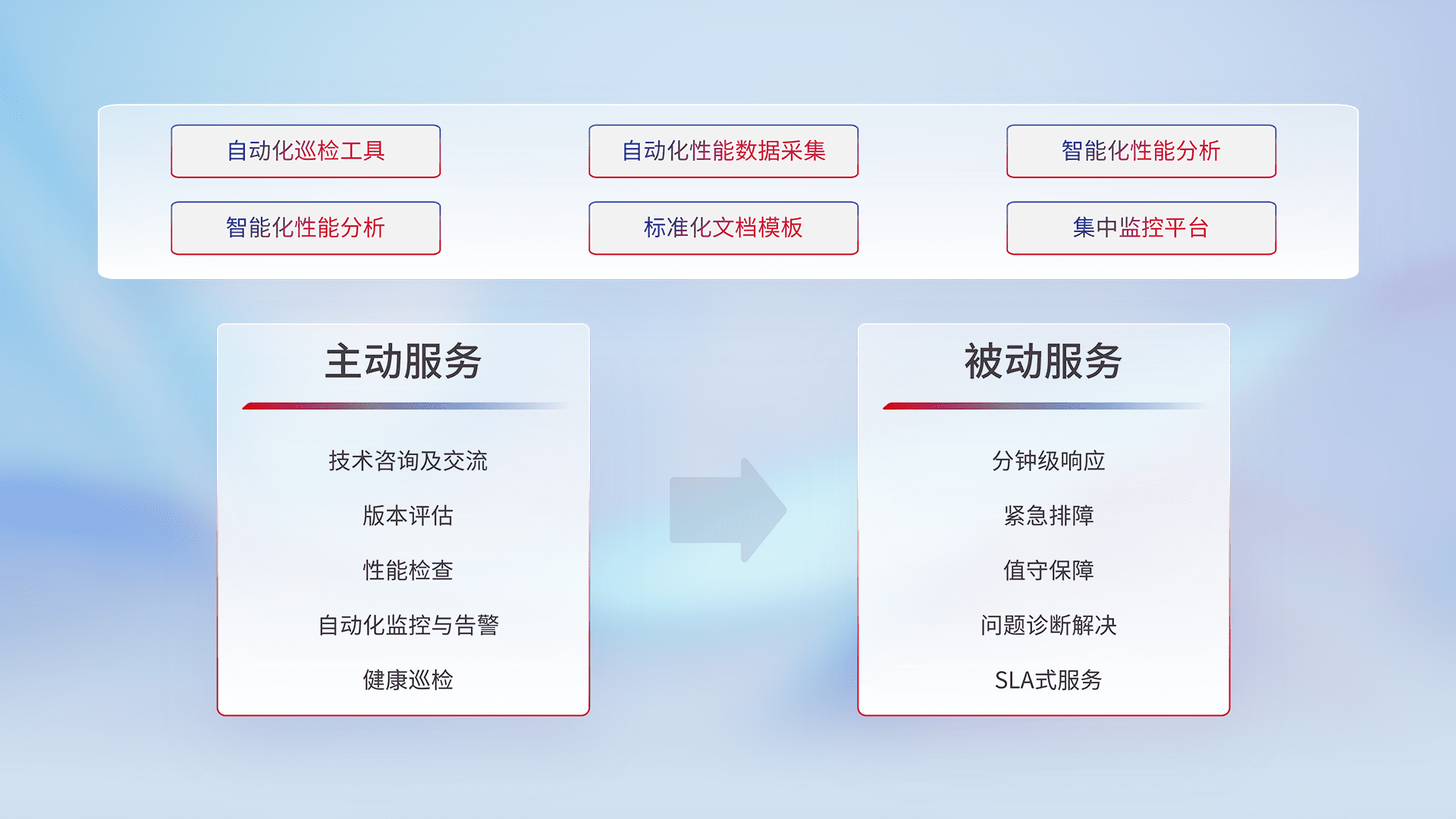 智能化工具和标准化文档,,保障服务质量,,提供主动服务(包含技术咨询、、、版本评估、、、性能检查、、自动化监控与告警、、、健康巡检)和被动服务包含(分钟级响应、、、、紧急排障、、、、值守保障、、问题诊断解决、、、SLA服务)。。。。