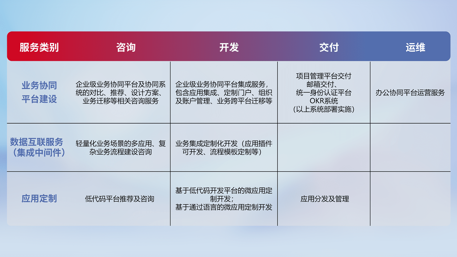 针对钉钉、、、企微、、IDaas等平台级产品提供产品的规划、、、方案、、、、交付、、、定制化开发等服务,,,,实现如统一协同办公、、、、智能客户服务、、混合会议管理、、、智能数据查询、、等业务场景,,实现数字化转型。。。。